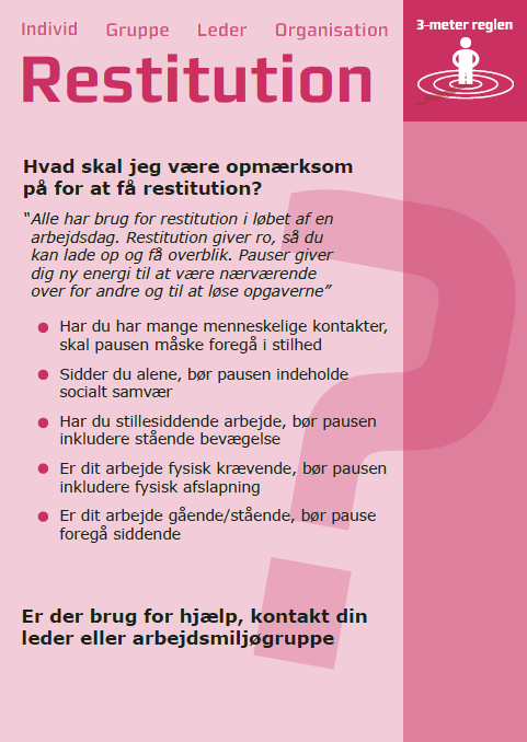 Restitution handler om pauser og hvileperioder til at koble af fysisk eller mentalt i løbet af arbejdsdagen og er en forudsætning for, at vi kan udføre vores arbejde godt, være en god kollega og have overskud til livet udenfor arbejdet.